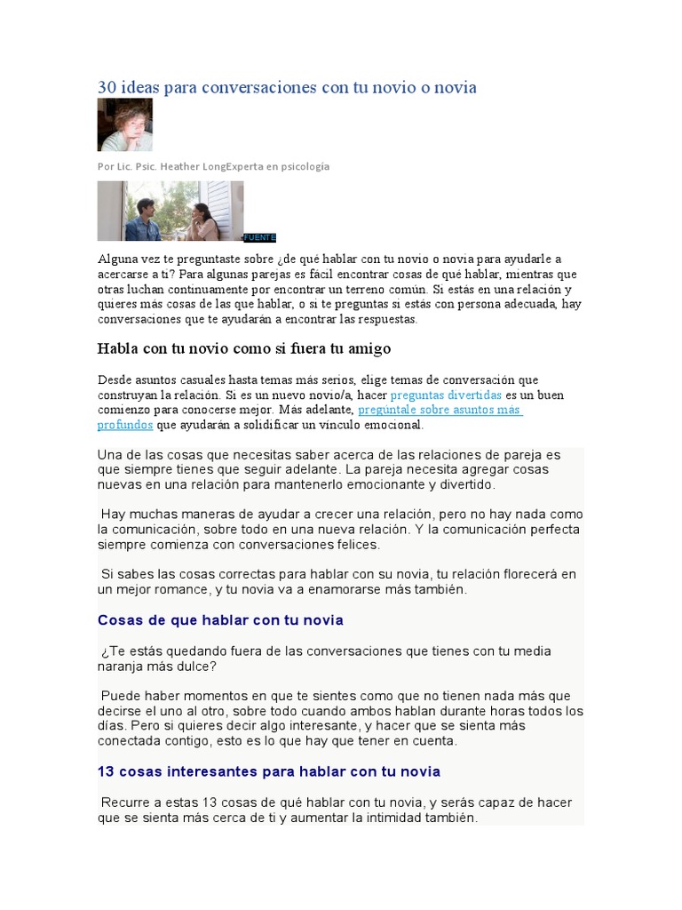 Además andar con alguien se. 4- Es importante hablar con tu pareja sobre sus respectivas familias. 1- Hablar sobre tu futuro. Un chico con novia esta muy interesado en ti si hace estas 7 cosas. Si es un nuevo novioa hacer preguntas divertidas es un buen comienzo para conocerse mejor. Así que evítate incomodas situaciones y de ahora en adelante conversa más con tu chica para que puedas mantener un ambiente armónico en la relación. Los temas a continuación te ayudarán a reforzar la confianza y comunicación.